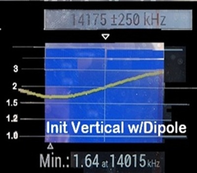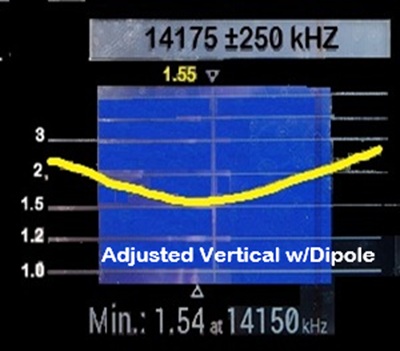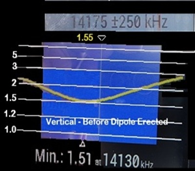 | For the right-hand image, the dipole has been mounted and raised. As might be expected, but not hoped, is that the nearby coax for the dipole and/or the dipole itself have changed the vertical's characteristics. What's not seen is the change in radiation pattern for either antenna. | |